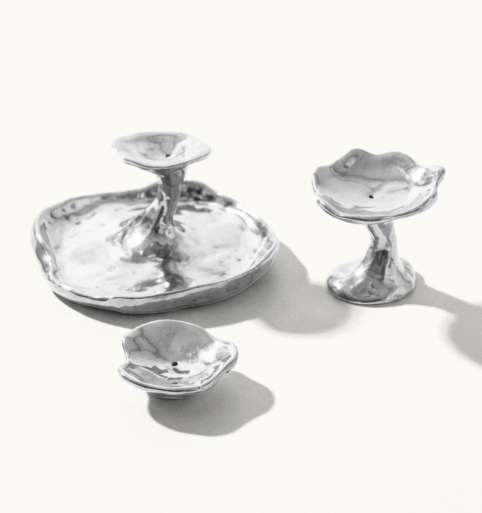 Objeto de decoração composto por três peças em alumínio fundido, esculpidas manualmente em formas orgânicas e irregulares. O conjunto explora volumes fluidos e uma estética escultórica, podendo ser utilizado tanto como castiçal quanto como suporte para incenso.